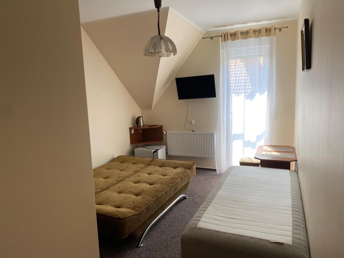 Pokój trzyosobowy z łazienką. The triple room provides a wardrobe and an electric kettle, as well as a private bathroom featuring a shower. This triple room features a carpeted floor, heating and a flat-screen TV. The unit offers 3 beds. Pokój Trzyosobowy - 3 osobowy. Powierzchnia pokoju ok.: 16 mkw. ;