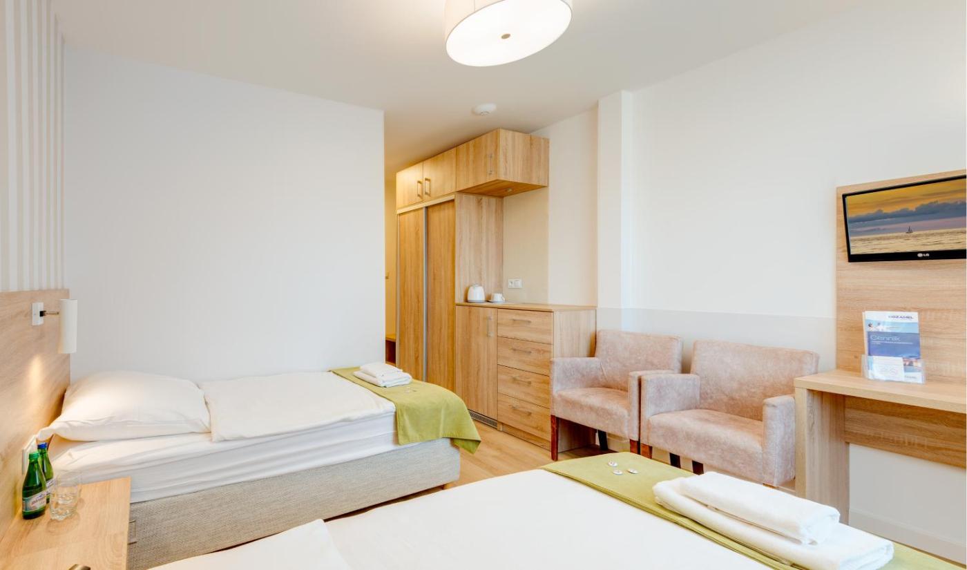 Pokój dwuosobowy. Ten pokój dwuosobowy mieści łazienkę z kabiną prysznicową. Zapewniono w nim także szafę i czajnik elektryczny. Pokój dwuosobowy oferuje telewizor z płaskim ekranem. Z okien roztacza się widok na wewnętrzny dziedziniec. Podłoga wyłożona została parkietem. Do dyspozycji gości są 2 łóżka. Pokój Dwuosobowy - 2 osobowy. Powierzchnia pokoju ok.: 19 mkw.