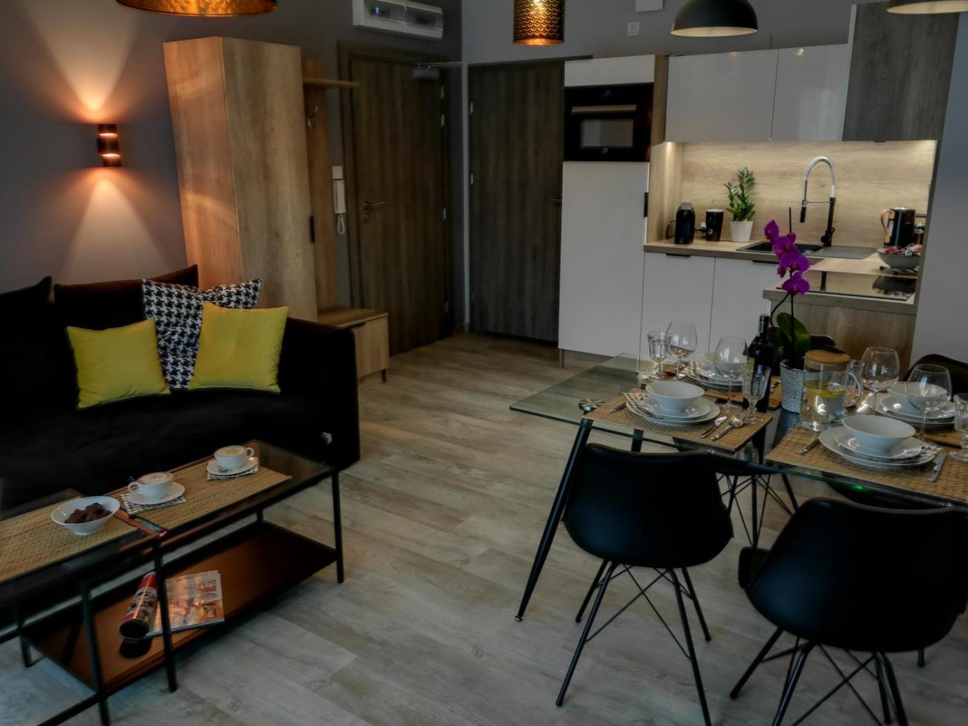 Oferta apartamentu obejmuje sypialnię (1), salon, aneks kuchenny z pełnym wyposażeniem, w tym lodówką i ekspresem do kawy, a także łazienkę (1) z prysznicem oraz suszarką do włosów. W apartamencie zapewniono ręczniki i pościel.